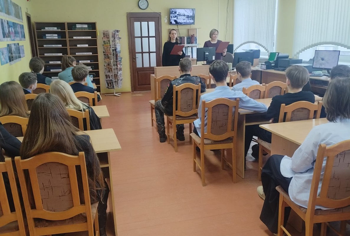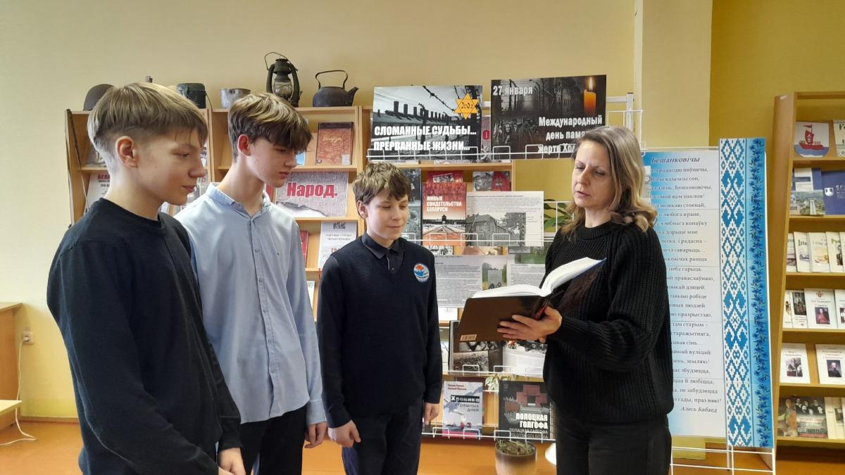 29 января в читальном зале районной библиотеки состоялся урок-реквием ”Холокост. Трагедия народов“, посвящённый Международному дню памяти жертв Холокоста. В мероприятии приняли участие учащиеся 8-го класса ГУО ”Средняя школа № 2 г. п. Бешенковичи им. Героя Советского Союза Михаила Николаевича Ткаченко“.