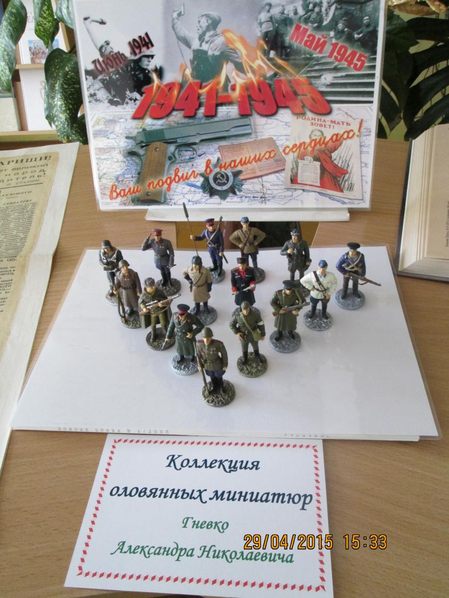 К Дню Победы в читальном зале ЦРБ оформлена выставка-просмотр "Ваш подвиг в наших сердцах". На выставке представлены книги о Великой Отечественной войне из фонда читального зала, а также коллекция оловянных миниатюр "Солдаты Великой Отечественной" активного читателя библиотеки Александра Николаевича Гневко.
